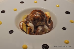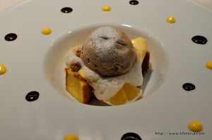 デセールは目の前でオレンジフォンダンケーキの上からショコラショー(ホットチョコレート)を掛け回し、できたてを頂きます。