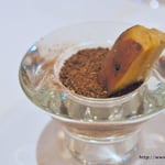 茄子を仕込ませたソルベの上に掛かっているのは…。鮮やかな深紅に輝くコンソメジュレ。ビーツの色なんだそうです。これにライムの風味を効かせて爽やかに。うん、おいしい。でももう少し暖かい季節の方が似合う前菜ですね。