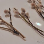 テーブルの上の飾り皿にはネコヤナギ。ガラス窓の向こうは真冬ですが、一足先に春の雰囲気ですね。