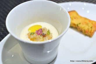 まずは一品目、ブランマンジェ仕立てのヴィシソワーズはスムーズな舌触り。うん、おいしい!やさしいだけではなく、胡椒でマリネされた小柱がしっかりと存在感を主張する一品。