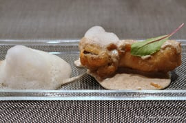 ベニエ、天ぷら状に上げられた松茸が香り高く美味。こちらはコンソメから作られたエスプーマが添えられていますが、しっかりと存在感あるエスプーマで、味の奥行きを増しています。