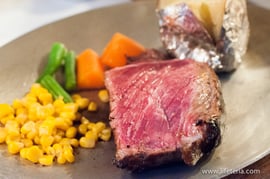 ブロックステーキはリブロース、ヒレ、サーロインと部位がチョイス可能ですが、ぼくも同行の友人も赤身好きなので、リブロースをオーダしてみました。
