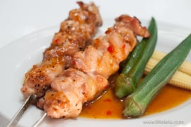 スパイシーチキンは串に刺した焼鳥スタイルで。甘くてスパイシーなアジアンテイスト。なんとなくタイ料理の焼鳥、「サテ」を思い出しました。