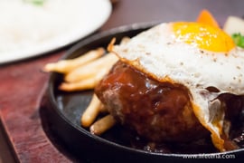 せっかくの立派なハンバーグ、目玉焼きは無いほうがルックス的にはいいんじゃないですかね。