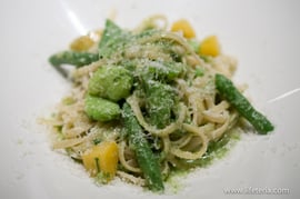 お腹に余裕のあるかたは、〆めにパスタをどうぞ、ということで、もちろん余裕ありなのでパスタを所望。サイズは小中大と選べますので、「大」(笑)。今夜のパスタは季節の野菜を使ったジェノヴェーゼソース。こちらのお店でジェノヴェーゼは初めてでした。ちょっと新鮮。