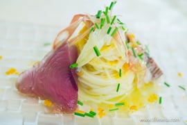 初鰹が添えられたカッペリーニはオリーブオイルとレモンで爽やかな味わい。そこにからすみの塩気と茗荷の香りがアクセントとして効いています。うん、これもウマいですね。