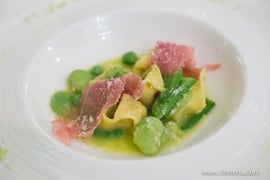 乾燥した蚕豆をピュレにして、さらに蚕豆やさやえんどうなど豆類と和えたところにパルマ産の生ハム。豆類のやさしい甘さに生ハムの塩気がよくマッチした佳品でした。