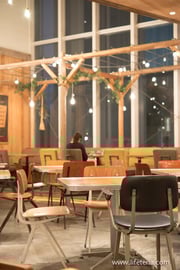 ゆったりとしたテーブル配置に高い天井。開放感のあるスペースです。