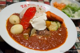 「モロッコご飯」はトマトベースのソースで、肉と人参、じゃがいも、ズッキーニなどの野菜を煮込みご飯とセットにしたもの。4種類のスパイスとサワークリームがアクセントです。