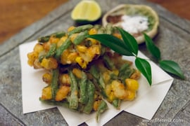 ・小柱、焼きトウモロコシ、隠元のかき揚げ