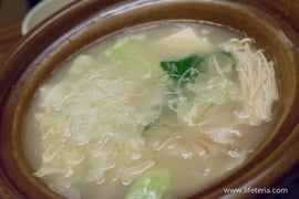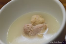 まずは鶏スープ。塩も入れずにひと口楽しみ、あとはお好みで塩などで味を整えて頂くという趣向です。