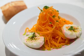 前菜は「キャロットラペ」。爽やかで食欲を刺激しますね。「ウフマヨネーズ」は卵のマヨネーズ和え。