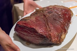 そして待ちに待った19時40分。焼き上がった大きな塊肉はいちどテーブルに運ばれてお披露目されたあと、さらにカットされて仕上げの火入れが行われます。