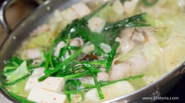 魚料理は「れんこ鯛アクアパッツァ」。魚介の出汁が効いているスープが滋味深く胃腸に沁み渡るかのよう。このスープでパスタなどを作ることもできるのですが、昨夜はもう一品食べたかったので、〆めはなしで「博多もつ鍋」。