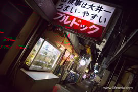 ひとがやっとすれ違えるくらいの細い路地に「御食事は大井一うまい・やすい ブルドック」と書かれた看板。