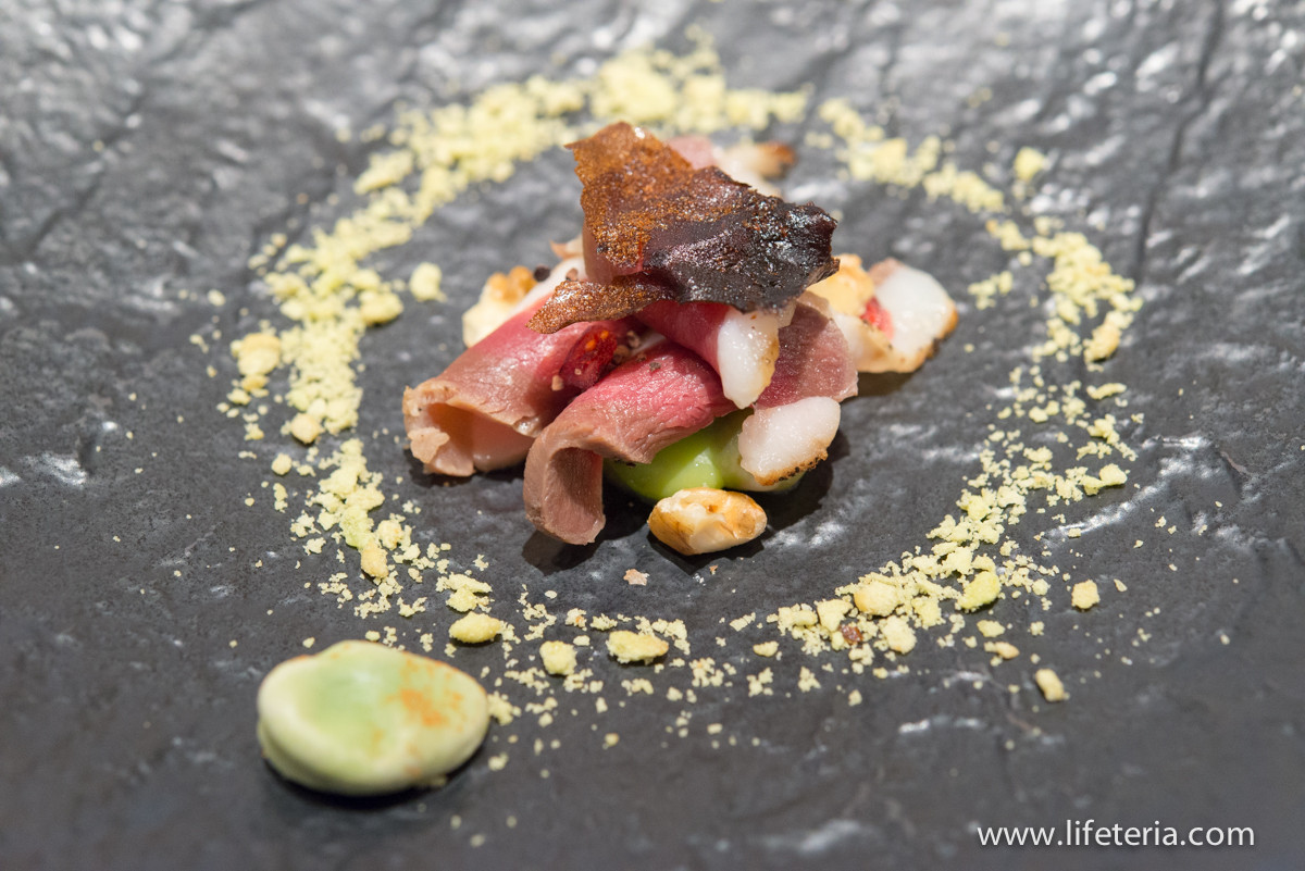 二品目の前菜は鴨でした。こちらは生ハム状に仕立てエイジングをかけた鴨に、エスプレッソから作られたフィルム状のかけらを添えて。さらに周囲には新茶の風味のシリアルを散らしてあります。