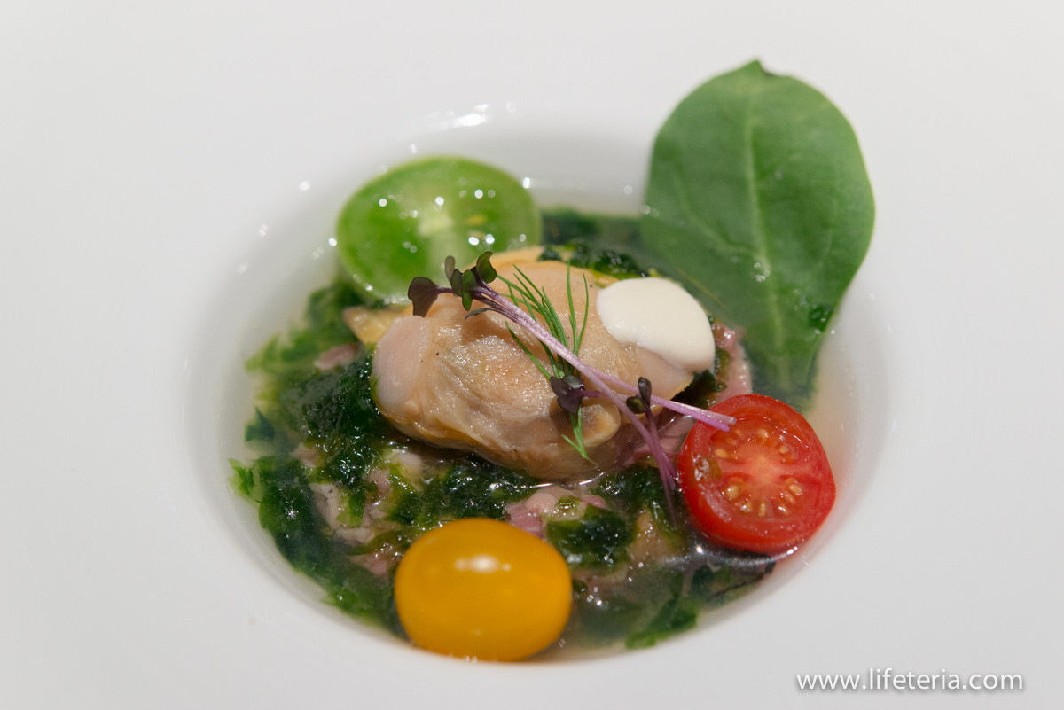 一品目の前菜は冷製のスープ仕立てにした蛤でした。非常に大ぶりな蛤は、身の旨さもさることながら、そのエキスとローストビーフなどの風味が溶け込んだスープが美味です。キリリとしたスープの塩味にフルーツトマトの甘さが引き立ちます。