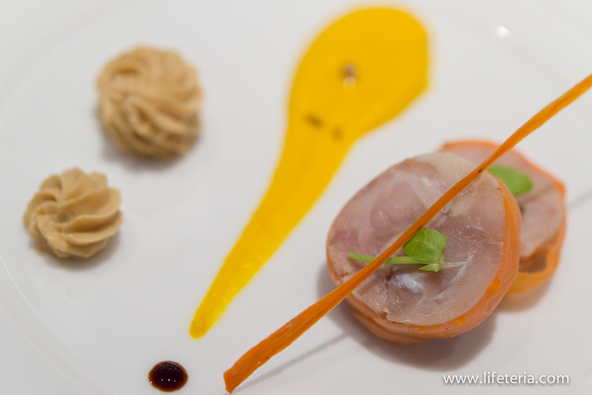 この兎に添えられているのは、シェフの遊びごころでしょうか、兎が大好きな「人参」。人参のチップとクミンやコリアンダーで香りを付けた人参のピュレ、そして奥はフォアグラのムースです。
