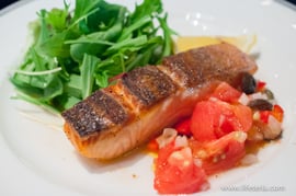 「自家製スモークサーモンのグリル」は脂がしっかり乗ったサーモンを香ばしく燻製にして。皮目はカリッカリに。対照的に身はたっぷりの脂でジューシーに。脂がちょっとtoo muchな感じもしますが、深夜にこんなウマいサーモンが食べられるのは幸せです。