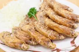 スパイシーチキンは串に刺した焼鳥スタイルで。甘くてスパイシーなアジアンテイスト。なんとなくタイ料理の焼鳥、「サテ」を思い出しました。