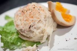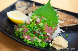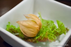 「ゆにおんサラダ」は塩味と胡麻油でさっぱりと。魚と肉と選べるので、魚をチョイス。鮪中落ちがあしらわれた和風のサラダ、これ悪くないですね。
