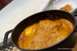 STAUBのココットでサーブされるカレーはインド風の味わい。うん、けっこう辛さもありますし、適度にスパイシーで悪くないですね。これは予想以上。なかなか本格派です。疑って失礼しました。