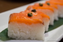 おおお?メニューの写真通りっていうか、写真を凌ぐ勢いで魚やら海老が盛り付けられていますよ。鮪を中心に鯛、穴子、烏賊、蛸、サーモン、いくら、雲丹、海老…。