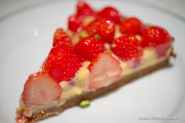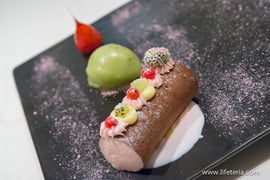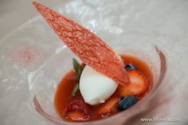 グリーンアスパラガスの美しい緑色に映えるトマトと苺の赤色。可憐なルックスのデセールですが、可憐なだけではなく、グリーンアスパラガスの香りが印象的な個性あふれるデセールです。