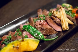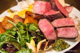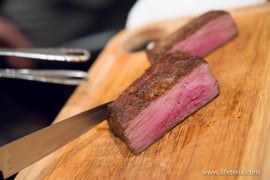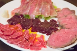実はこのブロック、前菜を食べ終わるとすぐにスタッフのかたが目の前で焼き始めてくれるんですね。しかし当然のことながら火が通るまで時間がかかります。なので、網のうえでこんがり色づいていく塊肉を横目で見ながら、カット肉をつまむ、というスタイルなのですね。