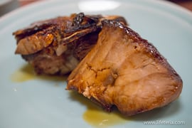 塊で焼くことにより、こんがり炙られた表面の香ばしさが強調されて、内面のサシの甘さが強調されます。たまり醤油と山葵で食べてもいいですが、熟成香を楽しみたいのであれば塩と山葵でしょうか。