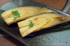 パン粉をまとった表面の香ばしさ、そして蛤から立ちのぼる燻煙香。これに濃厚なモリーユ茸のソースを添えてすばらしい肉料理の完成です。いや、ウマいですね。