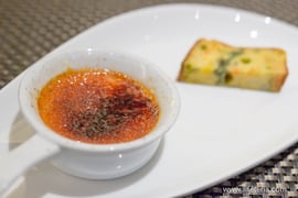 パリッとキャラメリゼされた表面を崩してスプーンですくうのはトマトの香りを湛えたクリーム。意外性が楽しいアミューズです。