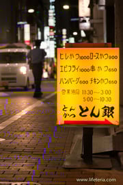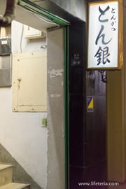 かなり年季の入ったオレンジ色の電飾看板の矢印が指すほうを見やると、古ぼけた雑居ビルに掛かった「とん銀」という袖看板。