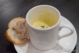 まずは「ウサギとポロ葱のテリーヌ ラヴィゴットソース」。ウサギのボリュームは少なめですが、まあ780円ですからね。味は悪くありませんが、ポロ葱がですね、ナイフでキレイに切れないんですよね。
